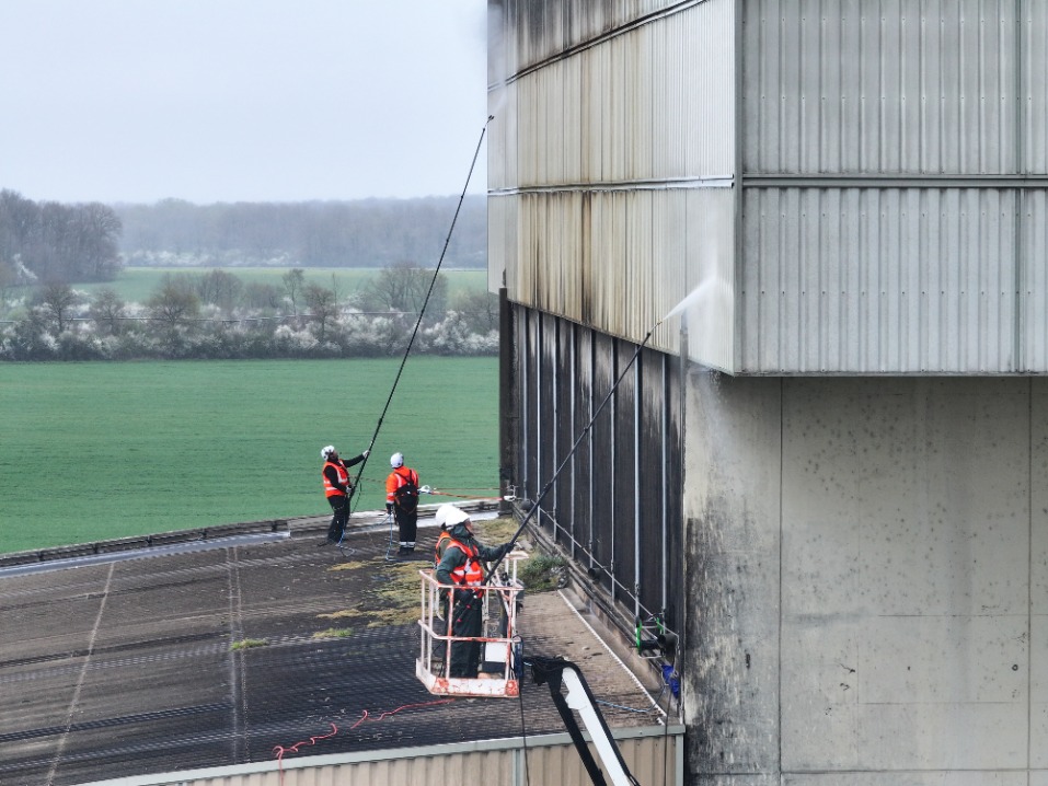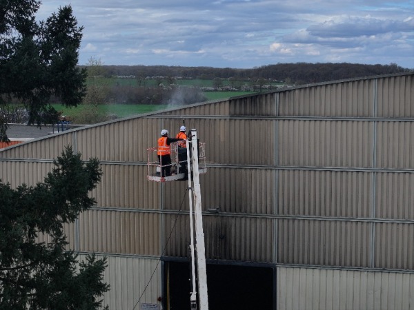 Nettoyage de façade industrielle à Gien avec perche haute pression et nacelle, permettant un traitement efficace des zones en hauteur.