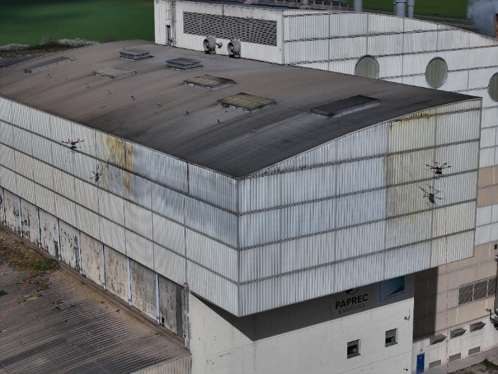 Nettoyage industriel par drone à Gien sur bâtiment de grande surface, avec intervention simultanée de deux drones Aéotic Spray-L.